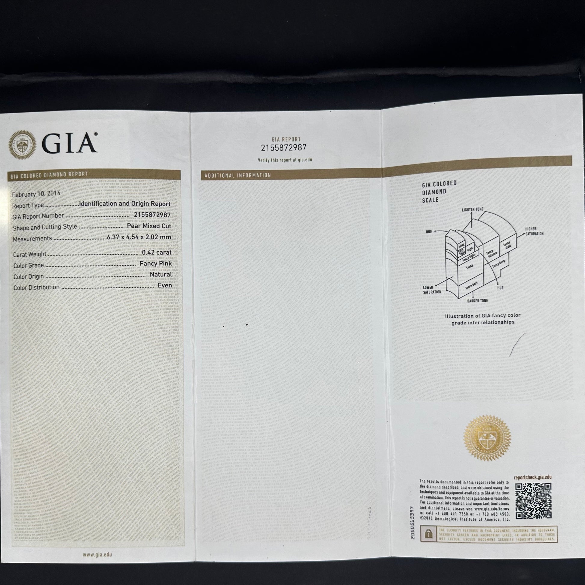 A refined and exceptionally elegant ring centered around a 0.42 carat natural Fancy Pink diamond, certified by GIA. Cut in a delicate pear mixed cut, the stone displays a soft yet vivid blush tone with an even color distribution — a rare characteristic sought after by collectors.